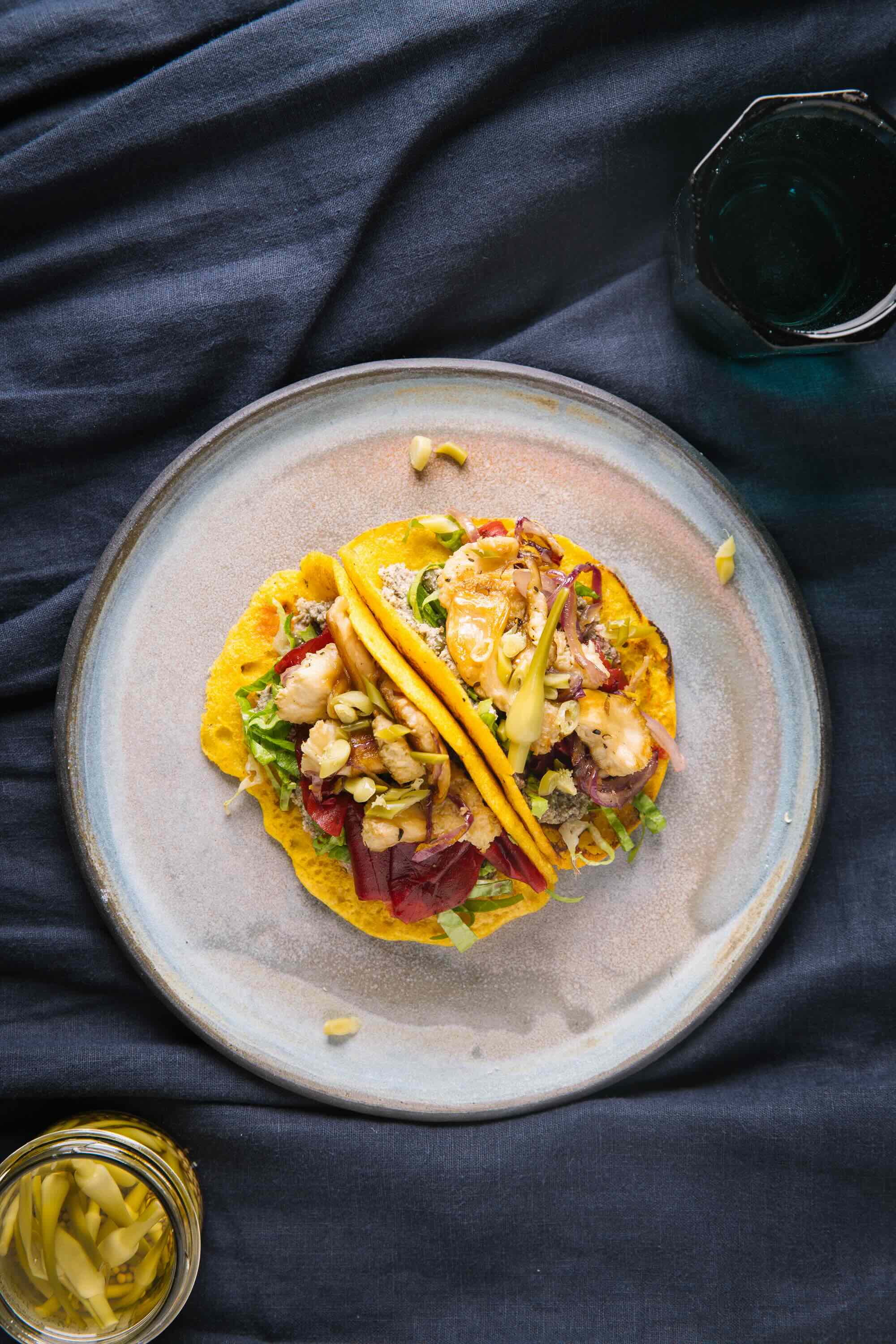 3. Warm the tortillas, spread with avocado cream, add the mushrooms, onion, cilantro, and drizzle with chili mayo.