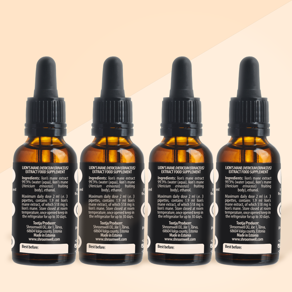 For adults, the maximum daily dose of the tincture is 3 pipettes (= 2ml), once a day, which includes 518 mg of Lion's Mane extract.